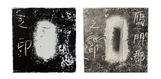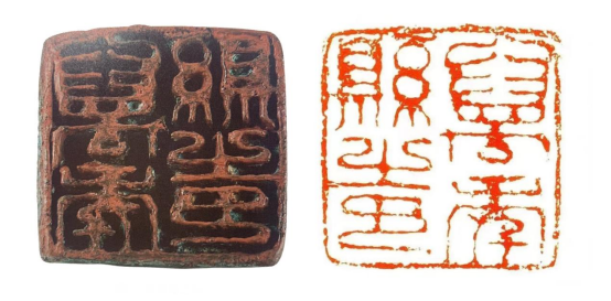 为了将隋唐官印从形制上与其它官印中区别出来,罗福颐先生通过对故宫旧藏几方的隋唐官印研究,归纳出隋唐官印的基本特征:一是加大了的鼻钮,二是有些有背款有印文铸出、印文篆书。隋唐官印的区别在于,隋印印钮“明显保留着汉晋鼻钮形式,钮顶呈半圆形,鼻厚而宽,孔穿较小,也是半圆形,整个外形完全是汉晋鼻钮的放大。”而“唐代官印的钮制与此有较大的差别,钮变高、薄、窄,孔穿随之变长,向后发展经五代至宋,逐渐形成橛钮,则完全失去鼻钮的形态。”由此,汉晋隋唐官印印钮的变化脉落已非常清晰:隋朝鼻钮加大,至唐朝早朝印钮变高变细,而到了五代宋变鼻钮为橛钮。官印制度的变化,学界关注的大多是印面的大小。隋唐官印的尺寸的增大,一般在5-6厘米之间。据孙慰祖先生研究唐官印印面平均尺寸为5.5厘米左右,“雁门郡之印”尺寸为5.4厘米,符合唐印官制。现就故宫博物院藏“中书省之印”与“雁门郡之印”背款做一比较,中书省之印可谓是公认的中唐官印标准器。其印面尺寸为5.7*5.6厘米,“雁门郡之印”尺寸为5.5*5.5厘米。二印尺寸相差无几,形制基本一致。