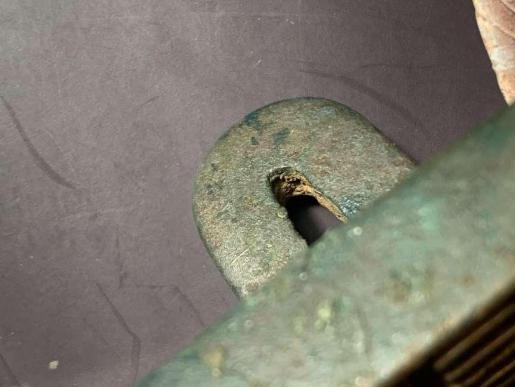 我们仔细观察这方印的鼻钮会发现,鼻钮的绳口隐隐约约能看出有磨损的痕迹。这说明鼻钮不仅是方便盖印时把握力度,同时可以看出,当时的官吏为了使用和携带方便,确实是用绳子拴系着鼻钮的,类似当今时髦女孩的手机链。用放大镜还可以看到鼻钮绳孔内侧,沉淀着微量的泥沙,已经和锈斑锈蚀融合在一起了。
