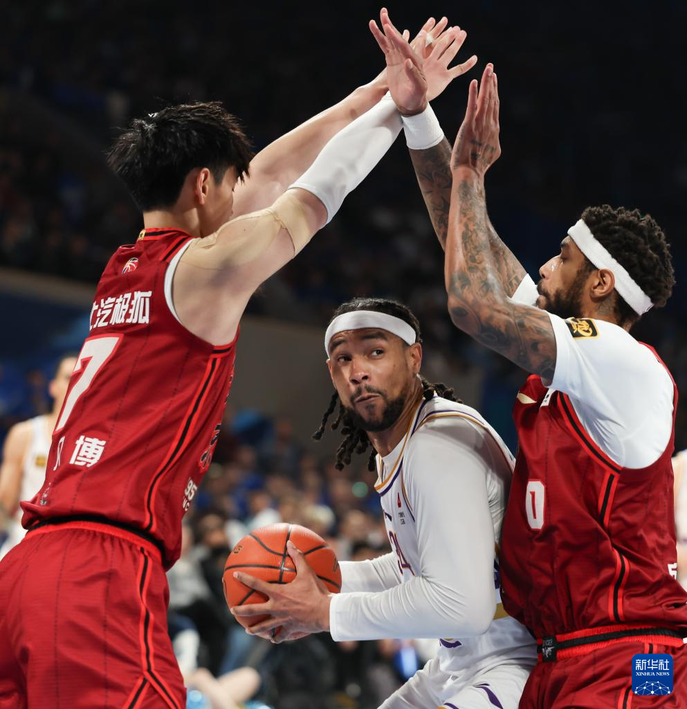 4月14日,北京控股队球员萨林杰(中)在比赛中进攻受阻。