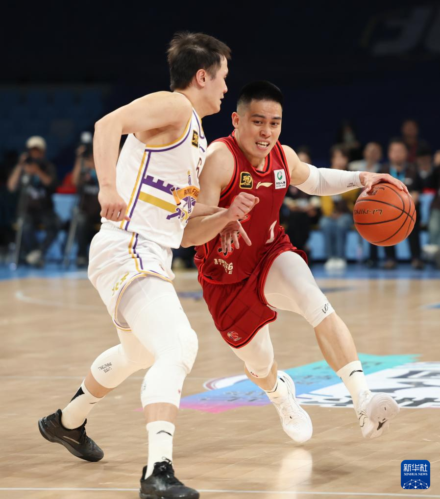4月14日,北京控股队球员廖三宁(右)在北京北汽队球员范子铭的防守下投篮。