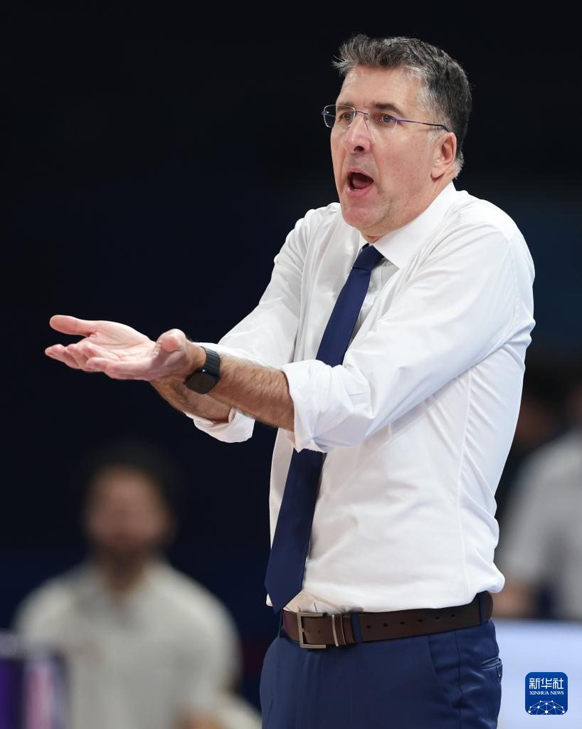 4月14日,北京北汽队主教练许利民(右)在比赛间隙指导球员陈盈骏。