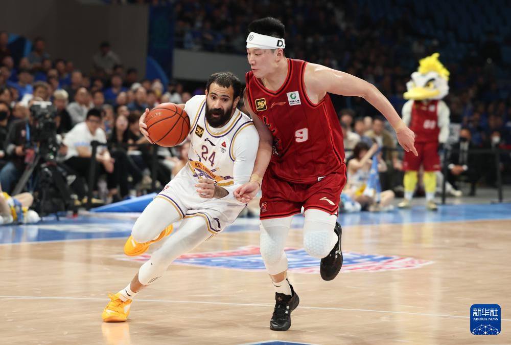 4月14日,北京控股队球员特莱斯(左)在比赛中突破。