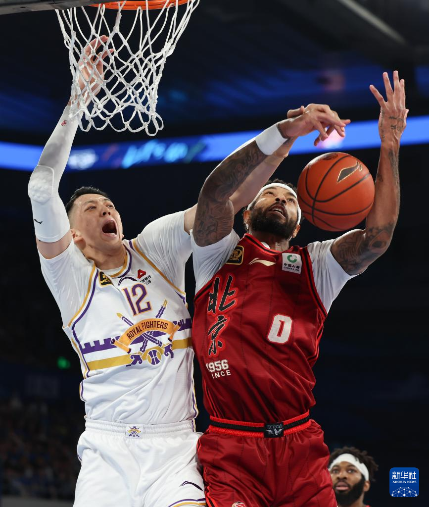 4月14日,北京北汽队球员纳托尔(上右)在比赛中上篮。