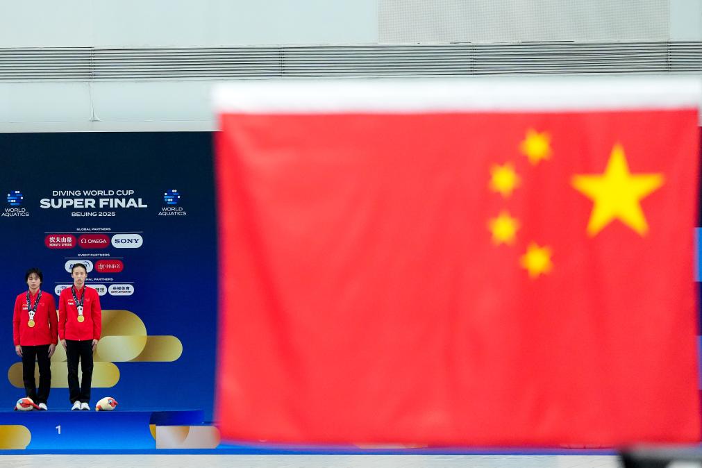 5月2日,获得2025年跳水世界杯总决赛女子双人10米台冠军的中国组合陈芋汐(右)/全红婵在颁奖仪式上。新华社记者 鞠焕宗 摄