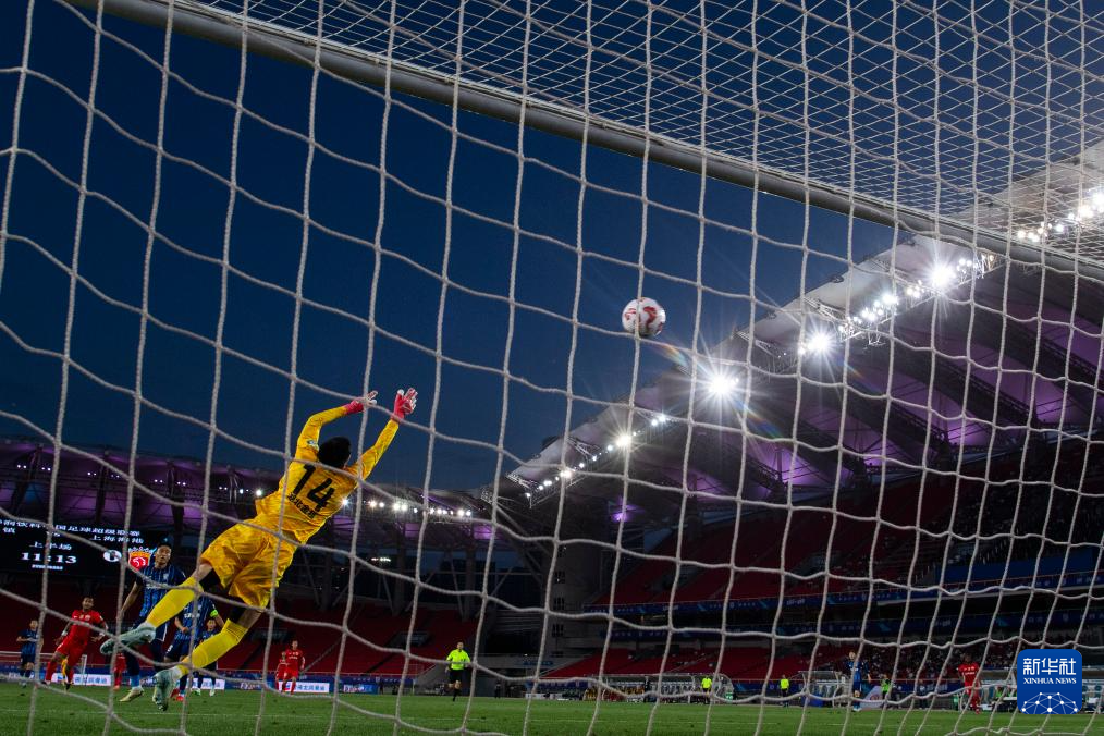 5月5日,上海海港队守门员陈威(左一)在比赛中扑救。