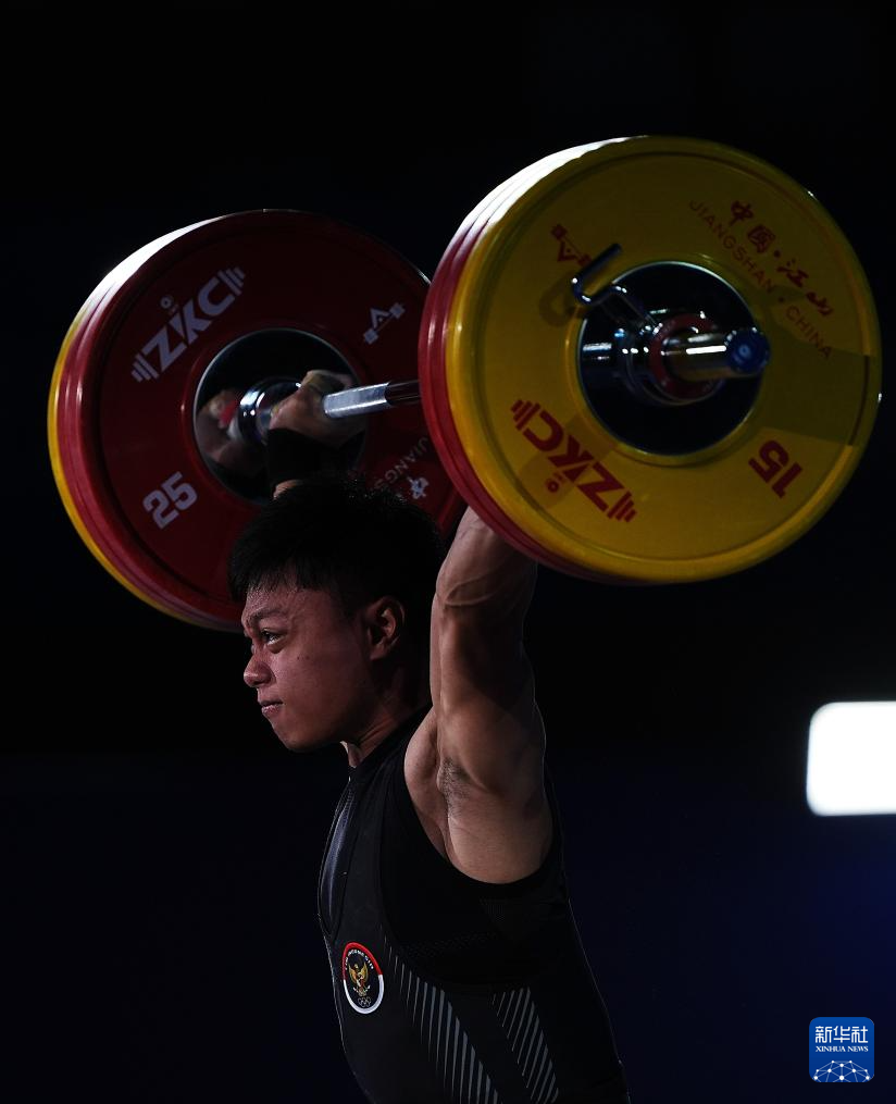 5月11日,印度尼西亚选手阿卜杜拉在比赛中。最终,他获得抓举、挺举、总成绩三项冠军,并以205公斤的成绩打破挺举世界纪录。