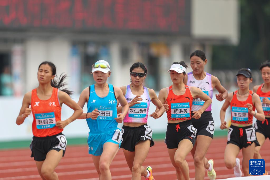 5月14日,河南队选手梁田田(左二)、西藏拉萨城投队选手次仁措姆(左三)、云南队选手蒋洪美(左四)在决赛中。最终,梁田田以16分06秒64的成绩夺得冠军。次仁措姆、蒋洪美分获亚、季军。