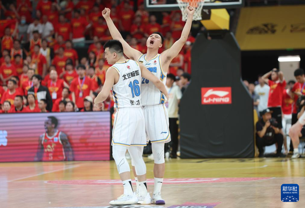 5月17日,北京北汽队球员翟晓川(右)在比赛中庆祝得分。