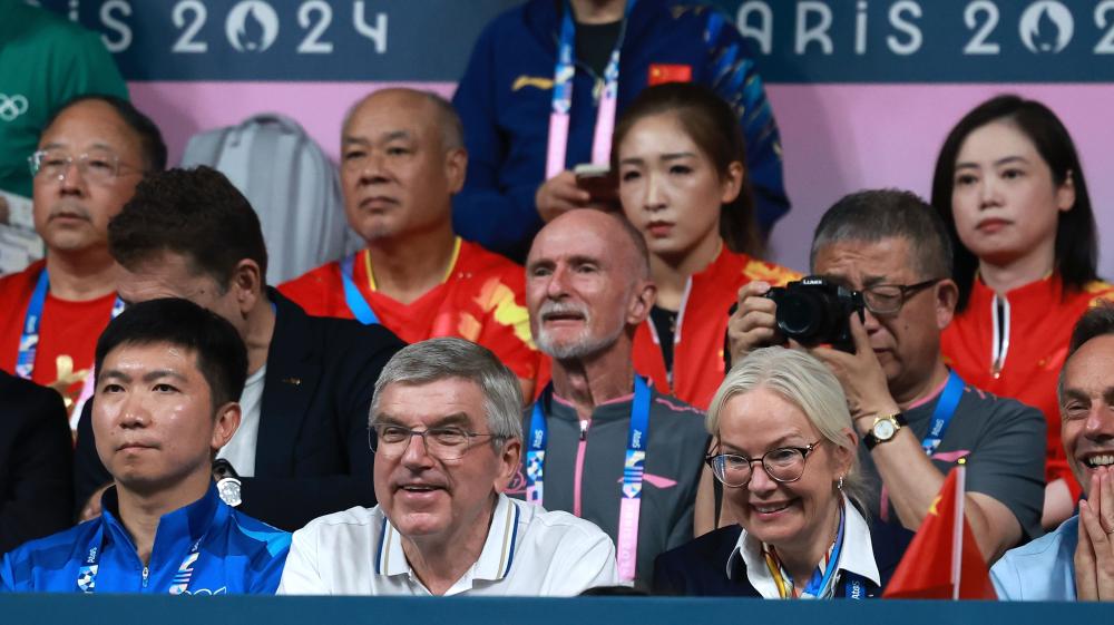 巴黎奥运会上国际奥委会主席巴赫(前排左二)现场观看比赛。新华社记者 刘续 摄