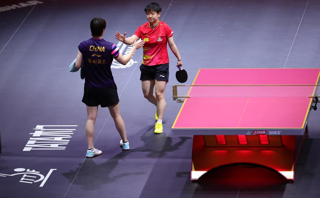 孙颖莎(右)与王曼昱在赛后互相致意。新华社记者 王东震 摄