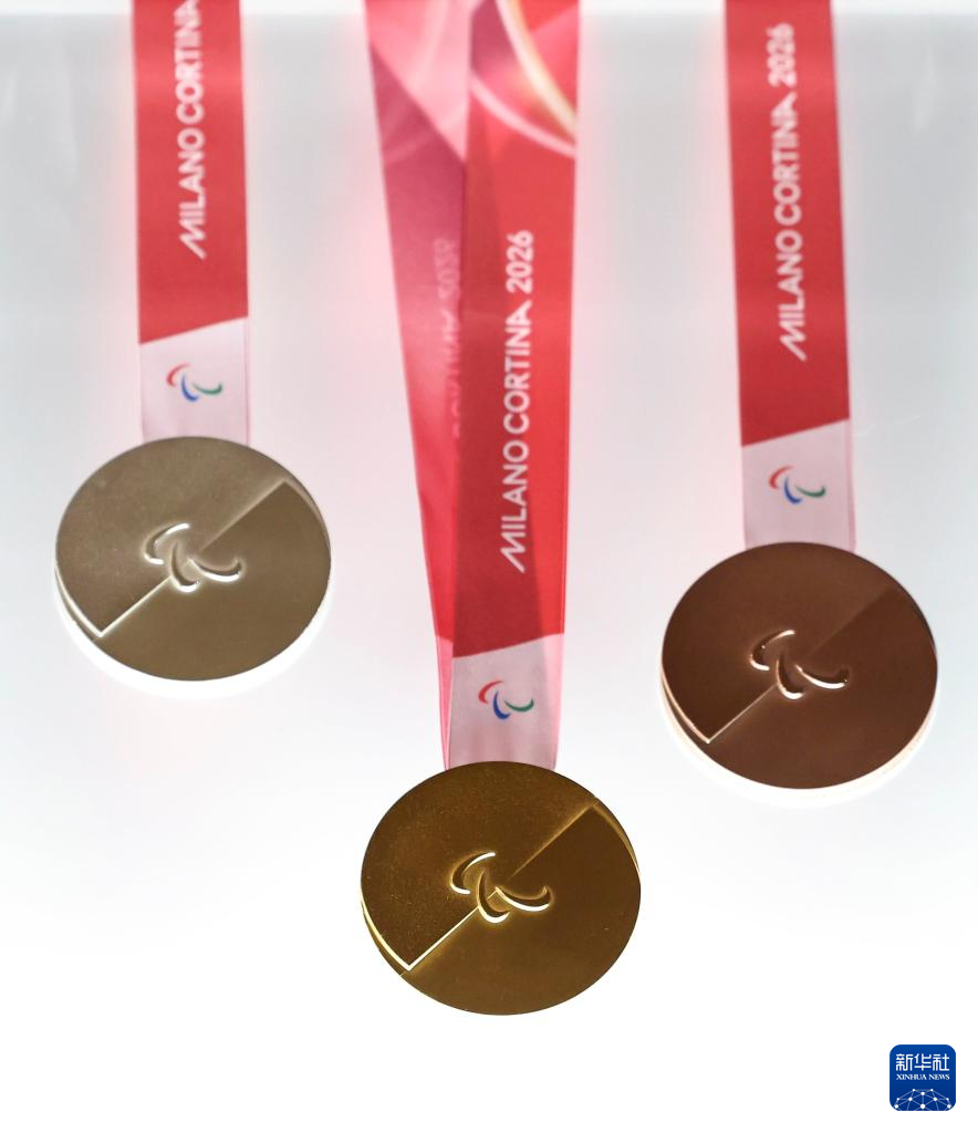 7月15日,2026年米兰-科尔蒂纳冬奥会和冬残奥会奖牌在意大利威尼斯的威尼托大区政府总部正式发布。这是发布活动现场拍摄的2026年米兰-科尔蒂纳冬残奥会奖牌。新华社记者 李京 摄