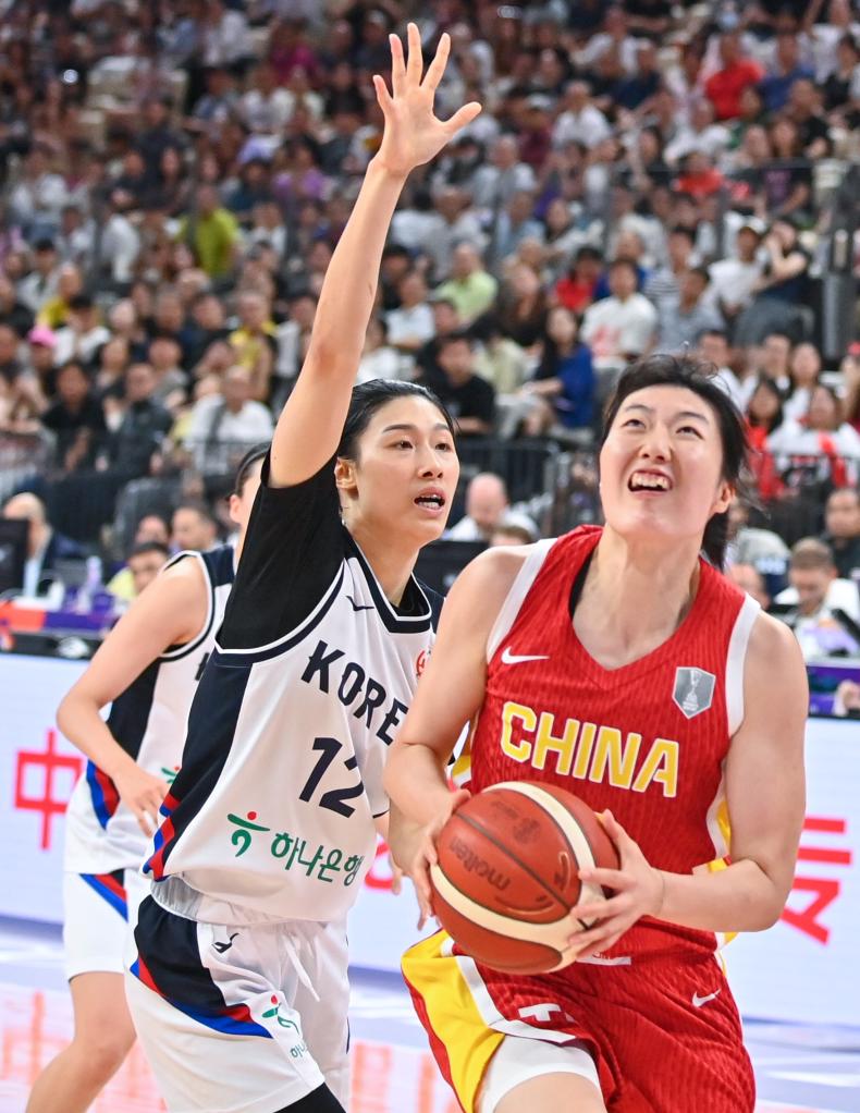 7月15日,中国队球员罗欣棫(右)在2025国际篮联女篮亚洲杯小组赛中上篮。新华社记者 肖恩楠 摄