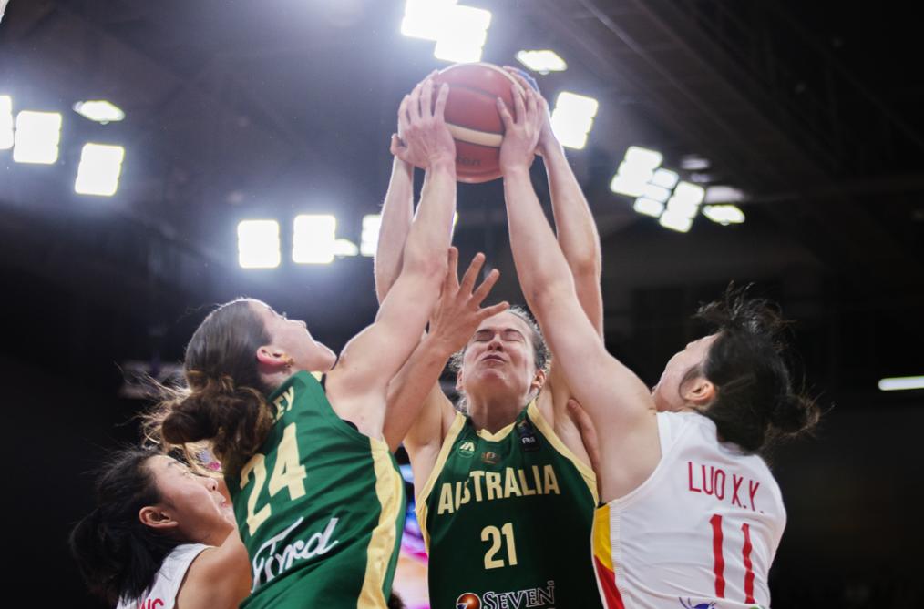 2023年7月1日,中国队球员罗欣棫(右)在2023年女篮亚洲杯半决赛中与澳大利亚队球员拼抢篮板球。新华社发(胡泾辰摄)