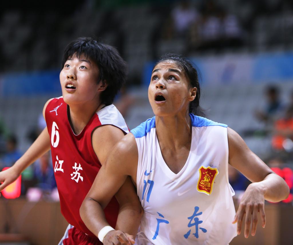 2017年8月24日,江苏队选手罗欣棫(左)与广东队选手迪拉娜在比赛中争抢篮板。新华社记者张誉东摄