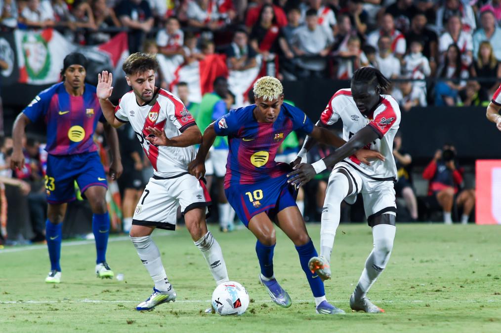 8月31日,巴塞罗那队球员亚马尔(右二)和巴列卡诺队球员乌奈·洛佩斯(左二)与西斯(右一)在比赛中拼抢。新华社发(古斯塔沃·巴连特摄)
