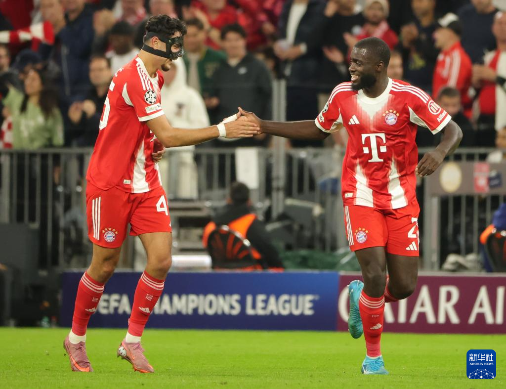 9月17日,拜仁慕尼黑队球员帕夫洛维奇(左)与乌帕梅卡诺在比赛中庆祝得分。