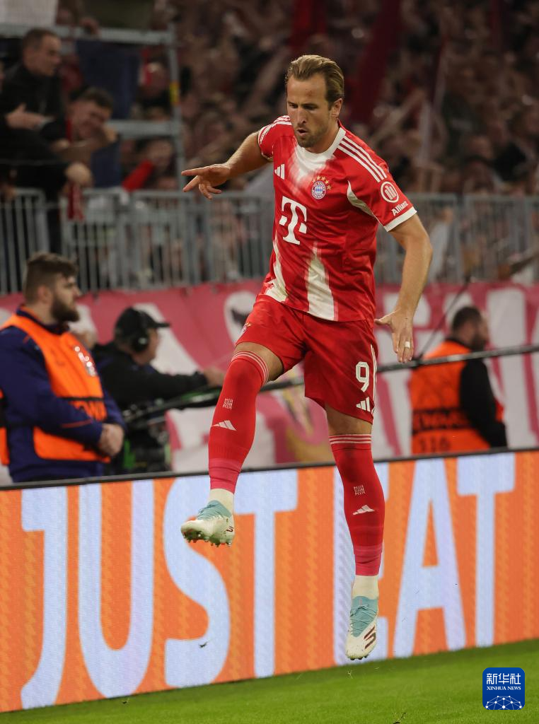 9月17日,拜仁慕尼黑队球员凯恩在比赛中庆祝得分。