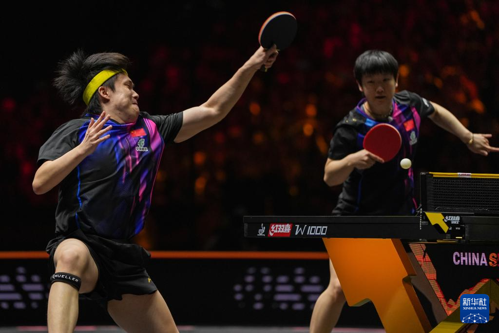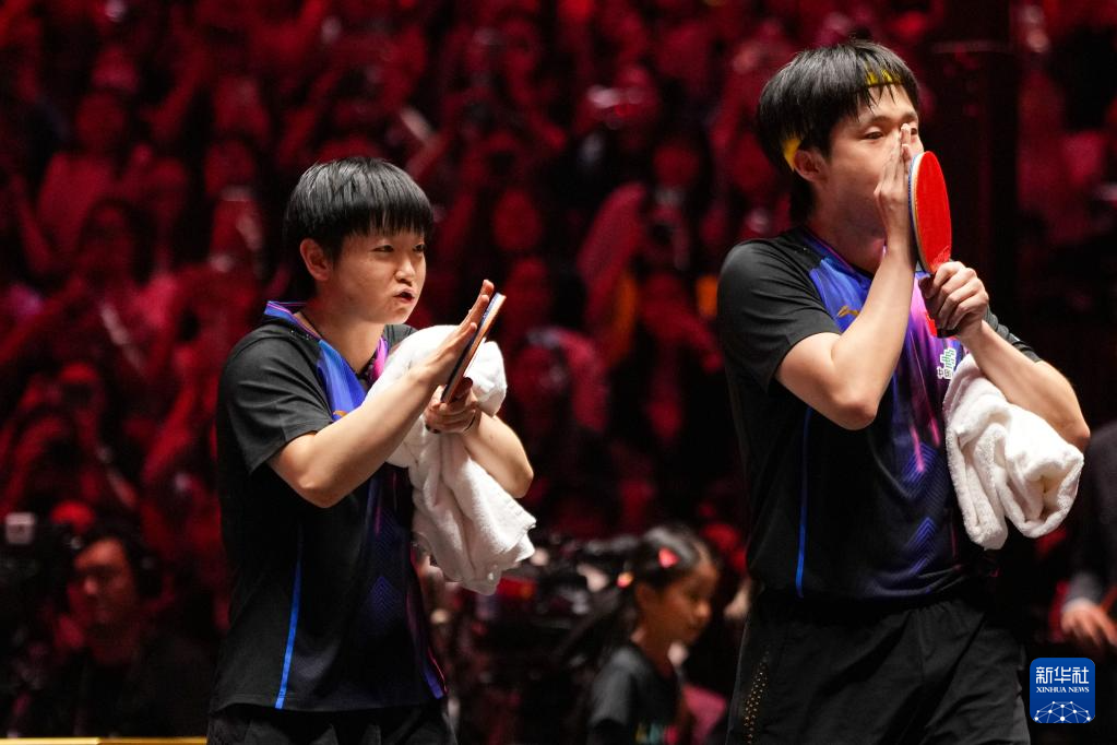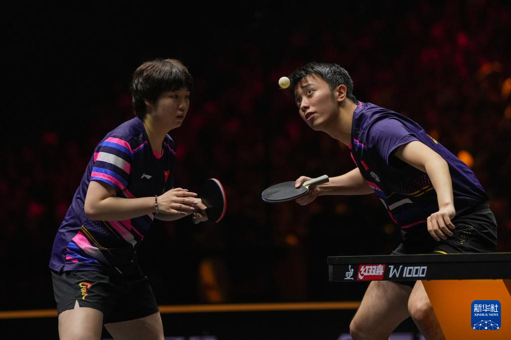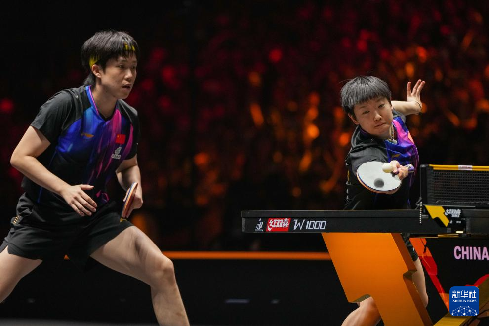 10月1日,中国组合王楚钦/孙颖莎(右)在比赛中。