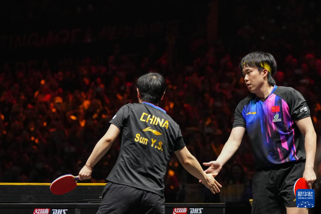 10月1日,中国组合王楚钦/孙颖莎(左)在比赛结束后击掌庆祝。