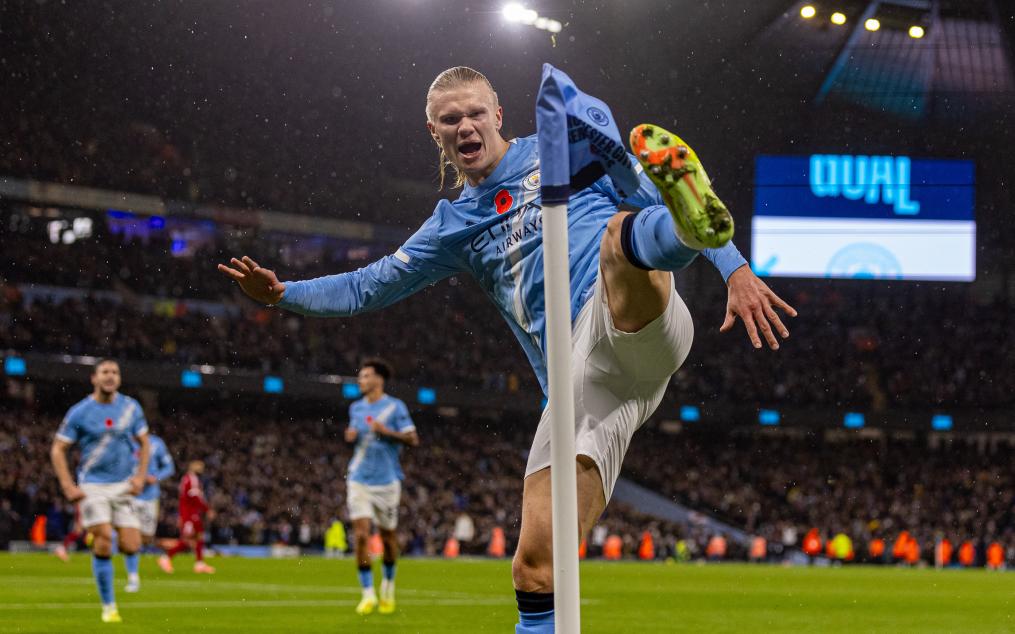 11月9日,曼彻斯特城队球员哈兰德庆祝进球。新华社发