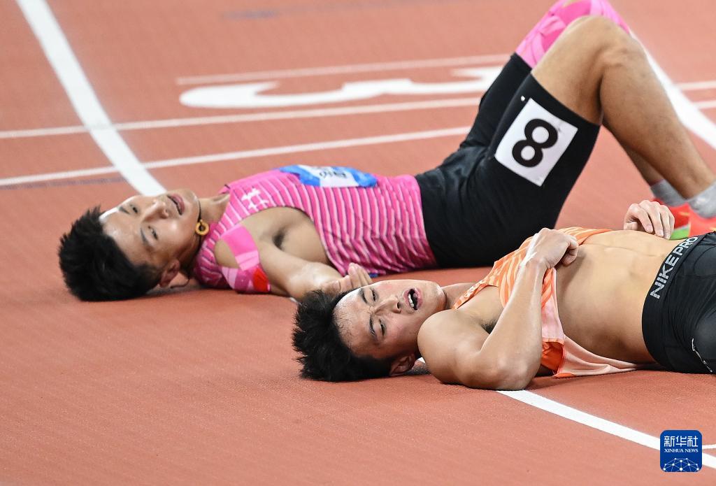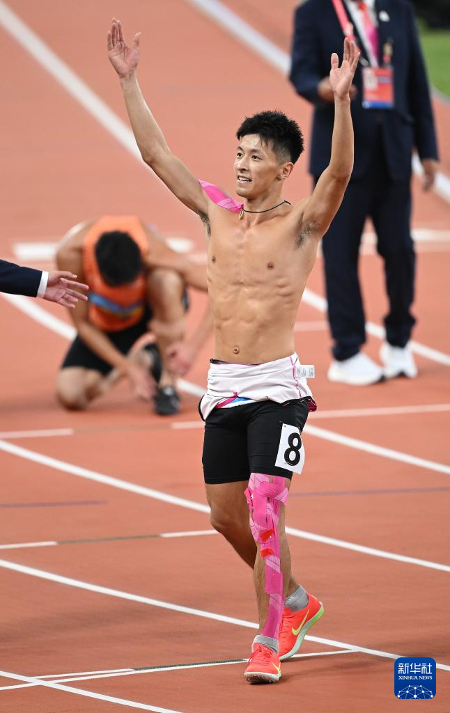 11月16日,浙江队选手华梓惠(前)在比赛后。最终,他获得男子十项全能冠军。