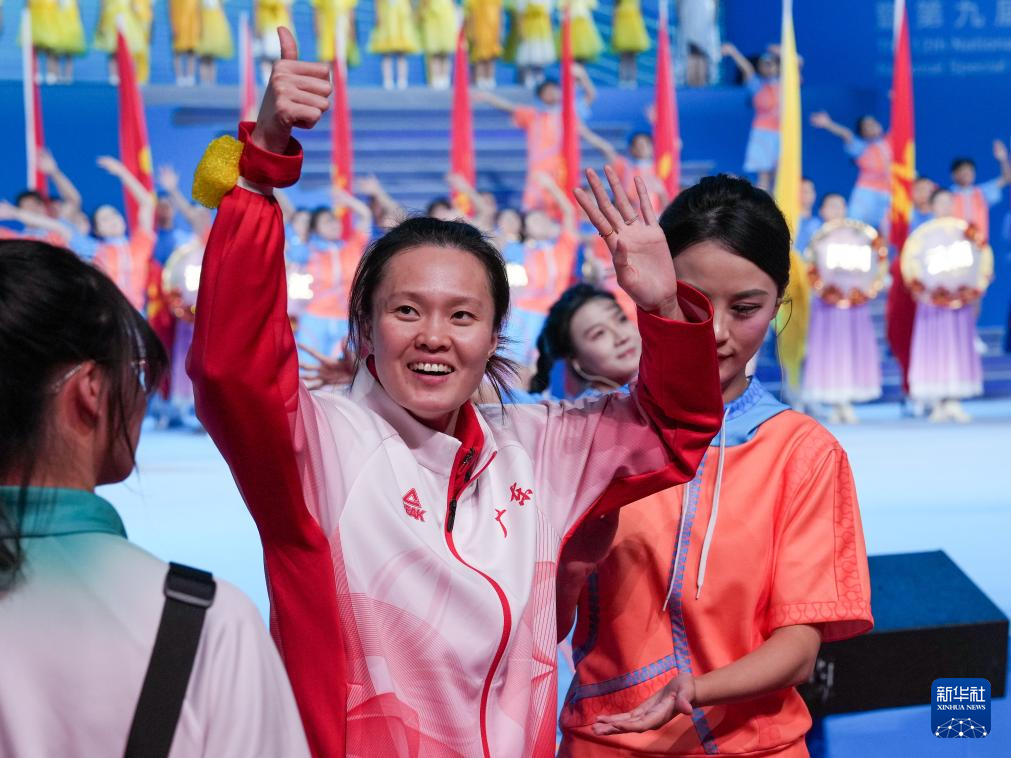 12月15日,在闭幕活动现场,广东队听障运动员朱倩(左二)向观众致意。