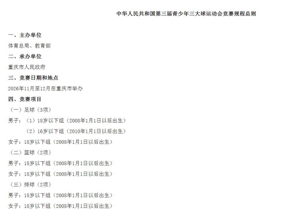 国家体育总局官网日前公布了关于举办该赛事的通知,确认这届比赛将于2026年11月至12月在重庆举行。其中,足球设男、女子18岁以下和男子16岁以下3个组别,而篮球和排球仍分别设男、女子18岁以下组这两个组别。各小项比赛成绩将带入第十六届全运会的总成绩册中。