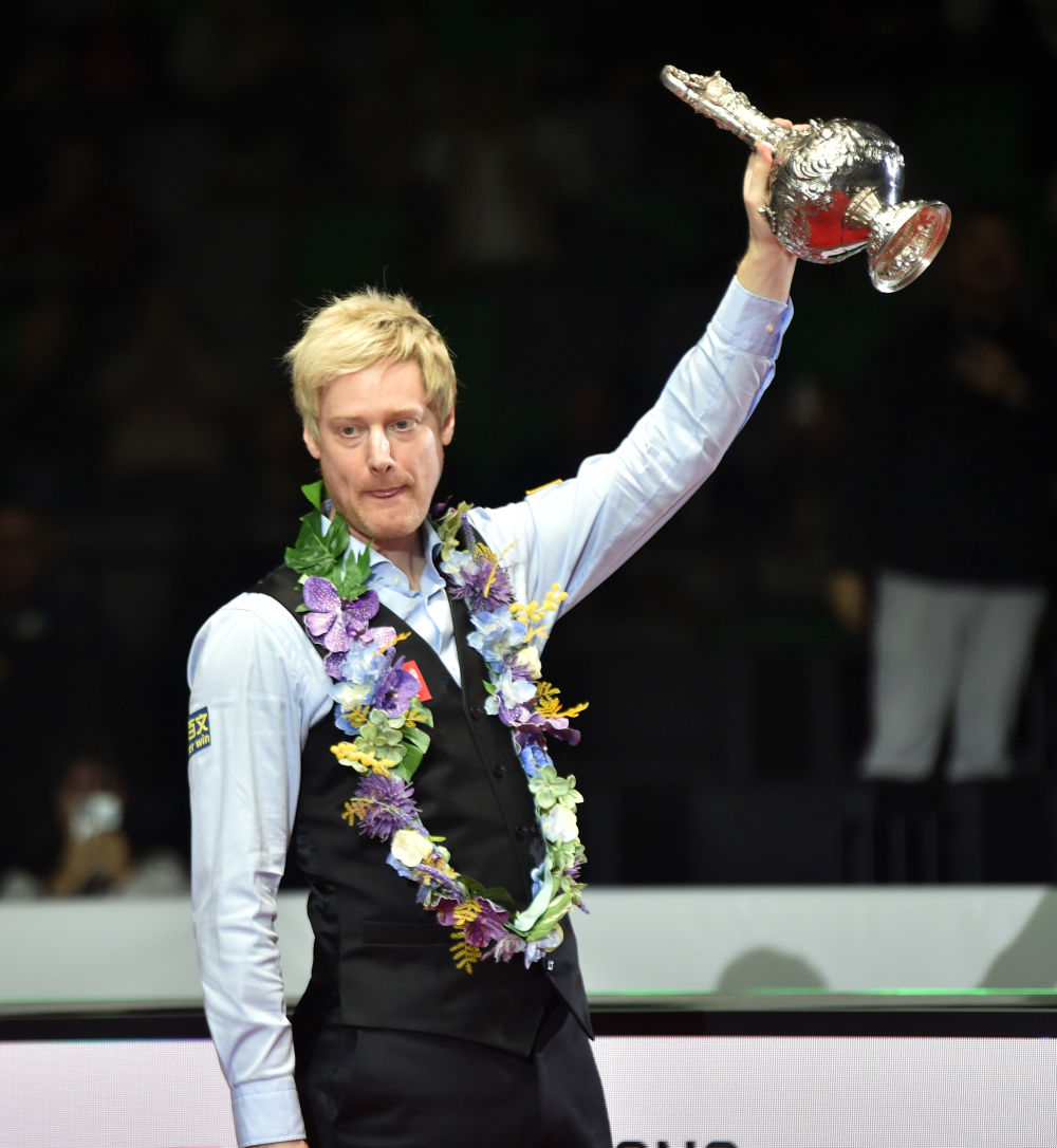 2025年3月9日,尼尔·罗伯逊在颁奖仪式上庆祝。当日,在2025年斯诺克世界大奖赛决赛中,澳大利亚选手尼尔·罗伯逊10比0战胜英格兰选手斯图亚特·宾汉姆,夺得冠军。新华社发(卢炳辉摄)