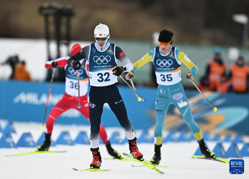 2月17日,中国选手赵子贺(中)在10公里越野滑雪比赛中。