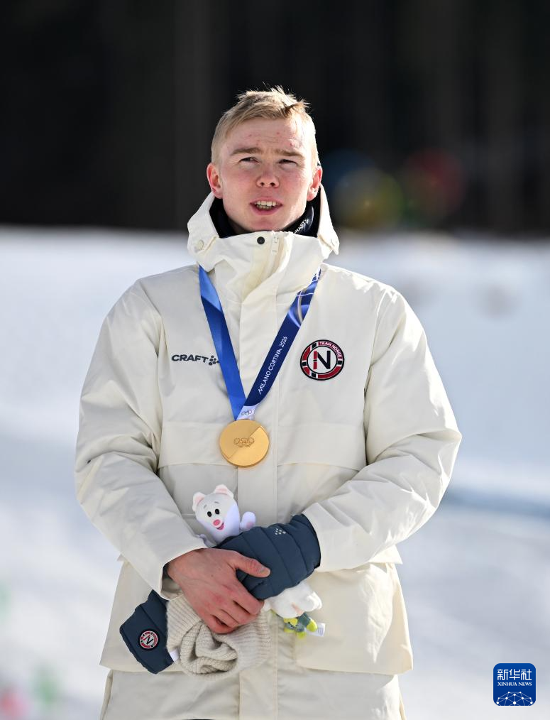 2月17日,冠军挪威选手奥夫特布罗在颁奖仪式上。