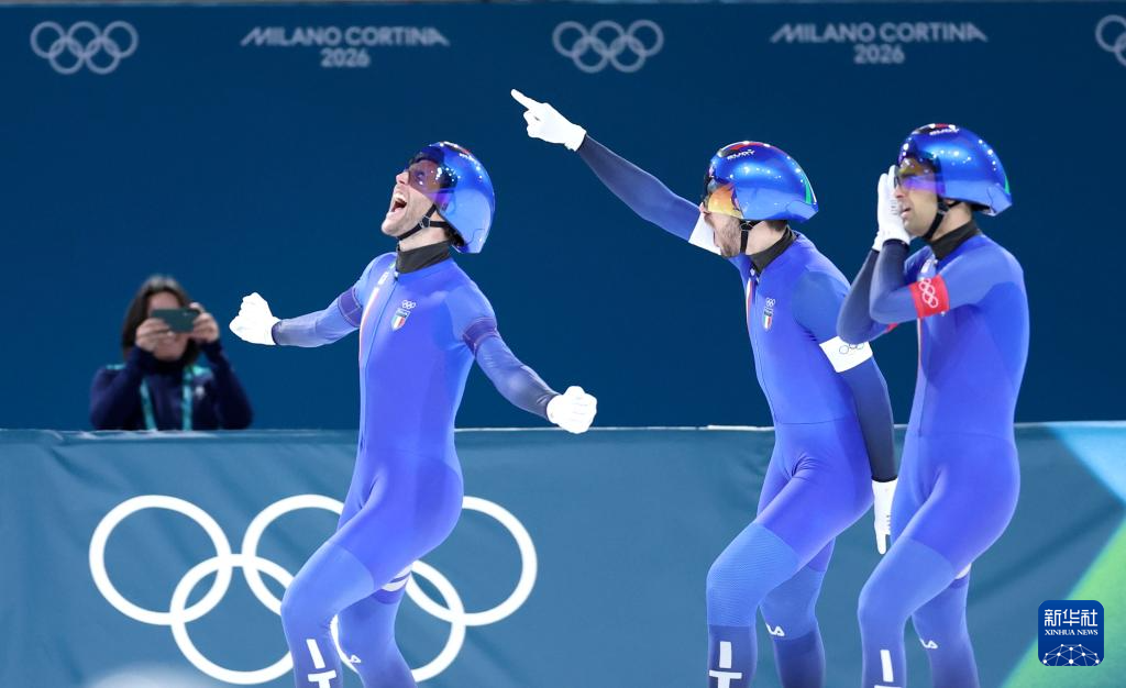 2月17日,意大利队选手安德烈亚·焦万尼尼、达维德·吉奥托、米凯莱·马尔法蒂(从左至右)在赛后庆祝。他们获得冠军。
