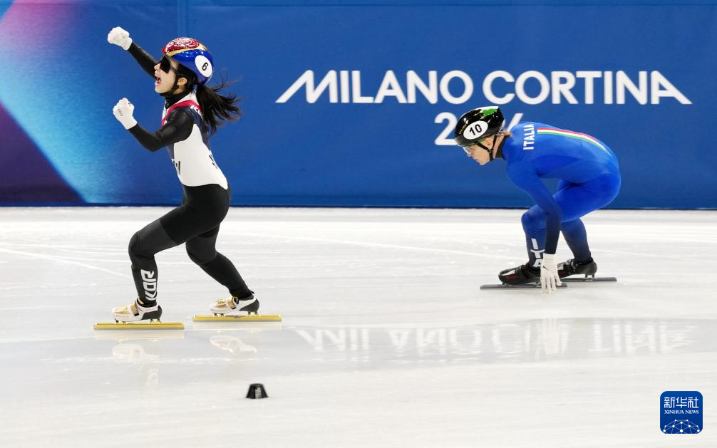 2月18日,韩国队选手金吉莉(左)在比赛中率先冲线后庆祝。