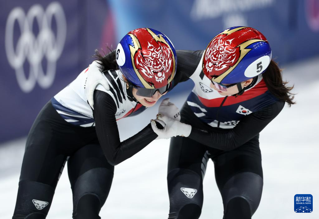 2月18日,韩国队选手金吉莉(右)率先撞线后庆祝。