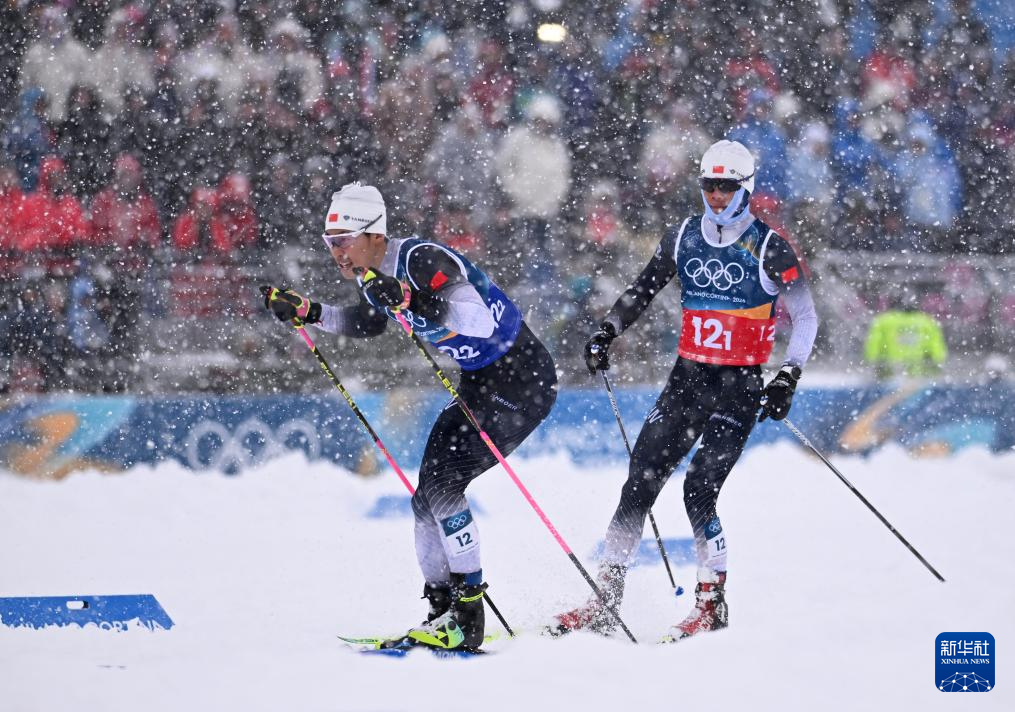 2月19日,中国队选手赵子贺(右)与赵嘉文在比赛中交接。