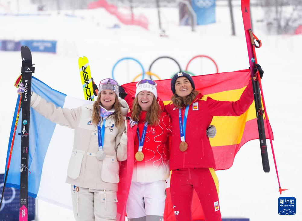 2月19日,冠军瑞士选手法东(中)、亚军法国选手哈罗普(左)和季军西班牙选手阿隆索·罗德里格斯在颁奖仪式上合影。