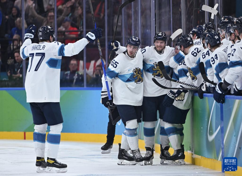 2月20日,芬兰队球员在进球后庆祝。