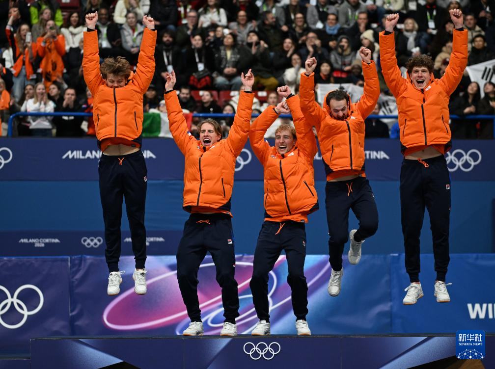 2月20日,荷兰队选手滕·布尔(前)与队友弗里索·埃蒙斯(中排左一)在比赛中交接棒。