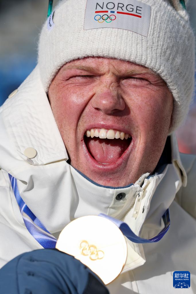 2月20日,亚军挪威选手斯图拉·霍尔姆·莱格雷德在颁奖仪式上庆祝。