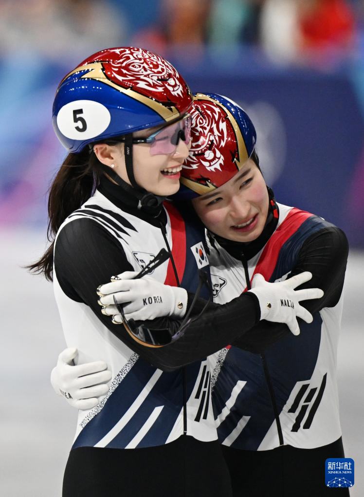 2月20日,冠军韩国选手金吉莉(右)与亚军韩国选手崔敏静在比赛后庆祝。