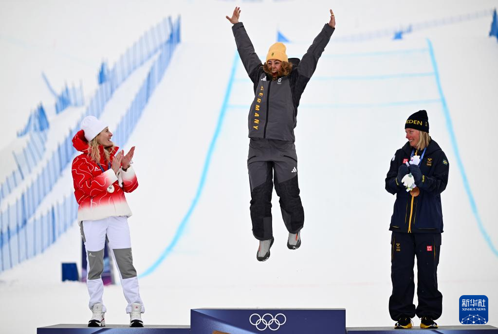 2月20日,冠军德国选手达妮埃拉·迈尔(中)、亚军瑞士选手范妮·史密斯(左)、季军瑞典选手桑德拉·内斯隆德在颁奖仪式上自拍合影。
