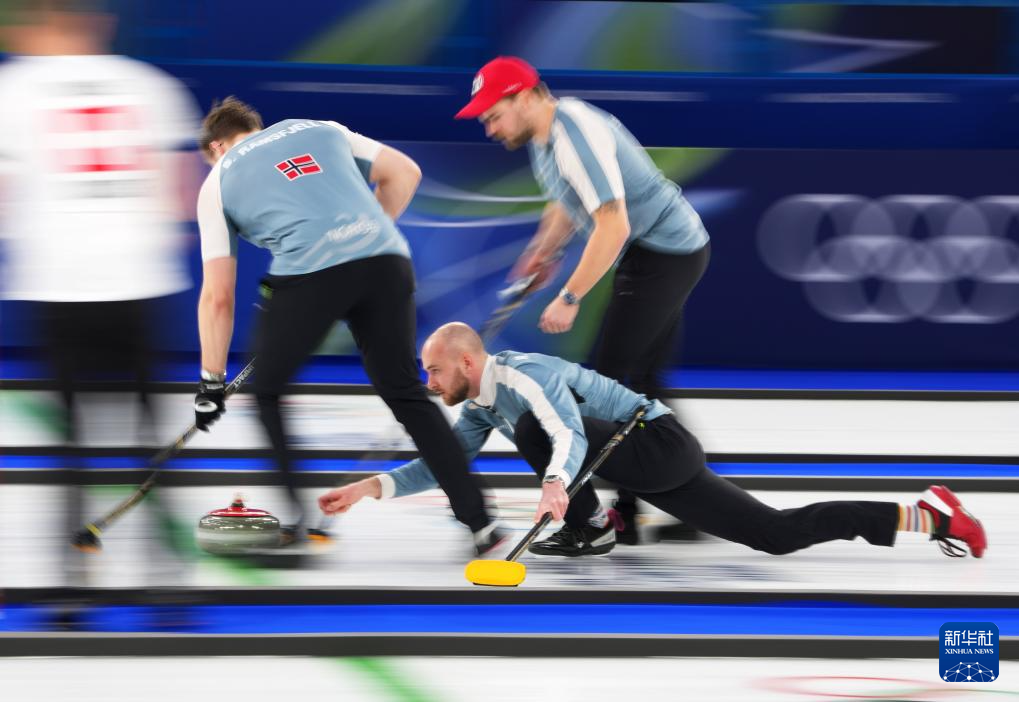 2月20日,挪威队选手塞萨克(中)在比赛中掷壶。