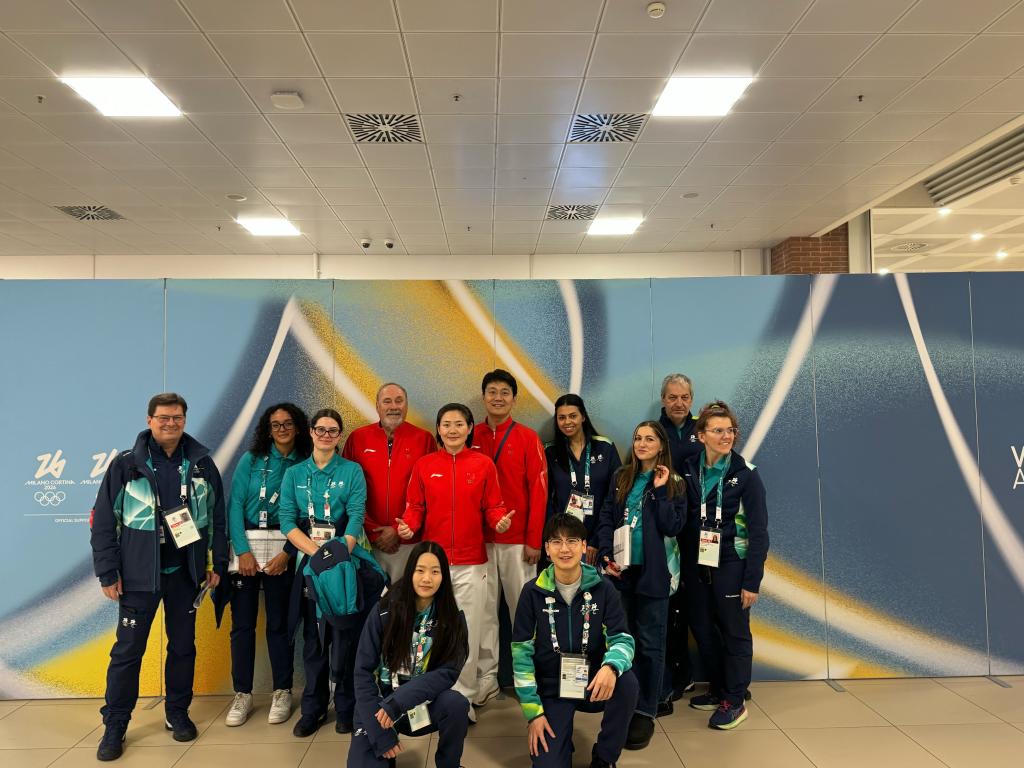 ↑在科尔蒂纳冰壶馆前的引导志愿者钟昕