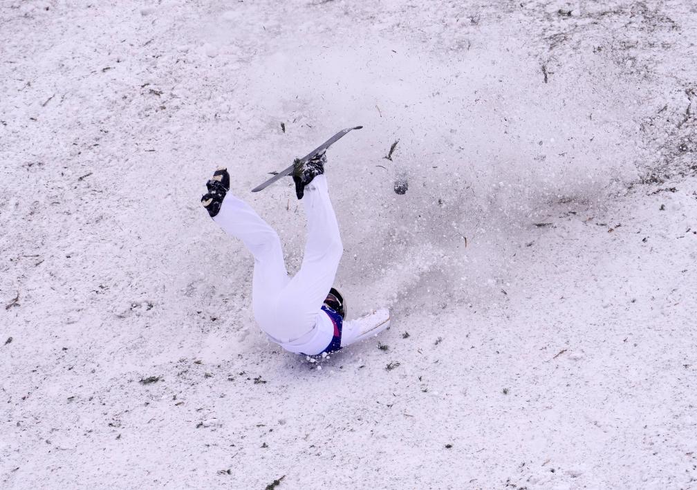 2月21日,中国队选手王心迪在第二轮比赛中摔倒。新华社记者 胡超 摄