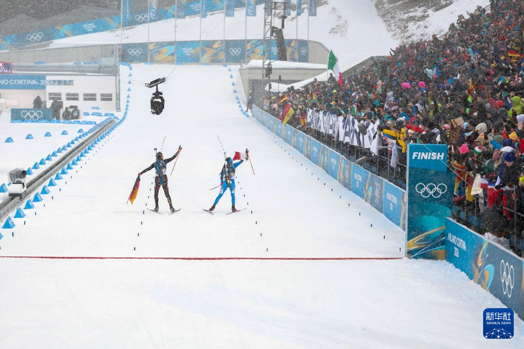 2月21日,德国选手普罗伊斯和意大利选手维雷尔(右)在终点处庆祝退役。
