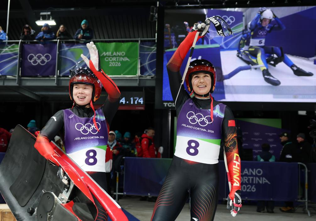 来自新疆的中国队选手古丽洁乃提·阿迪克尤木、居巴依·赛克依和队友们夺得雪橇项目团体接力赛第七名,刷新冬奥历史最好成绩。新华社记者 连漪 摄