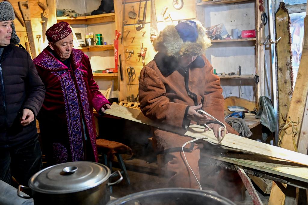 在新疆阿勒泰市,匠人为古老毛皮滑雪板穿皮绳。新华社记者 丁磊 摄