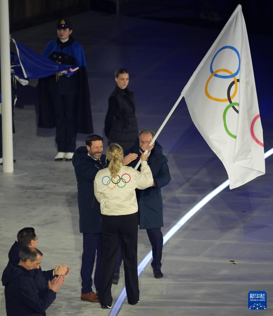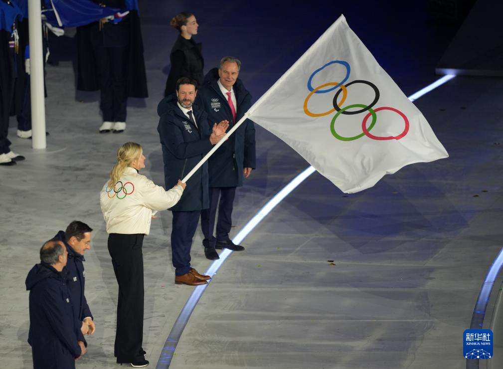 这是2月22日拍摄的闭幕式上的奥林匹克会旗交接仪式。