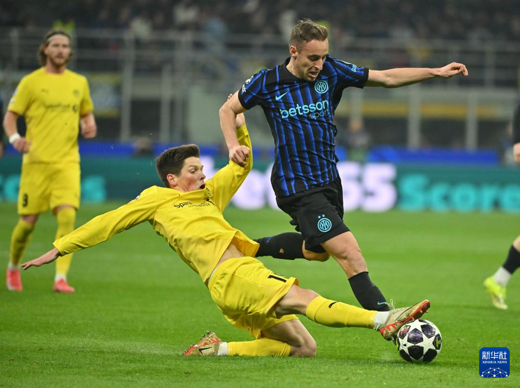 2月24日,国际米兰队球员巴雷拉(右)与博德闪耀队球员卡斯帕·霍在比赛中拼抢。