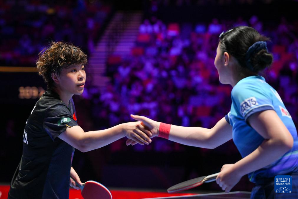 4月2日,王艺迪(左)在比赛前与张本美和握手致意。