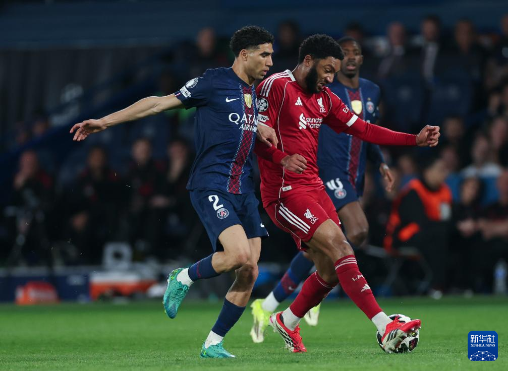 4月8日,巴黎圣日耳曼队球员阿什拉夫·哈基米(左)和利物浦队球员乔·戈麦斯在比赛中争抢。